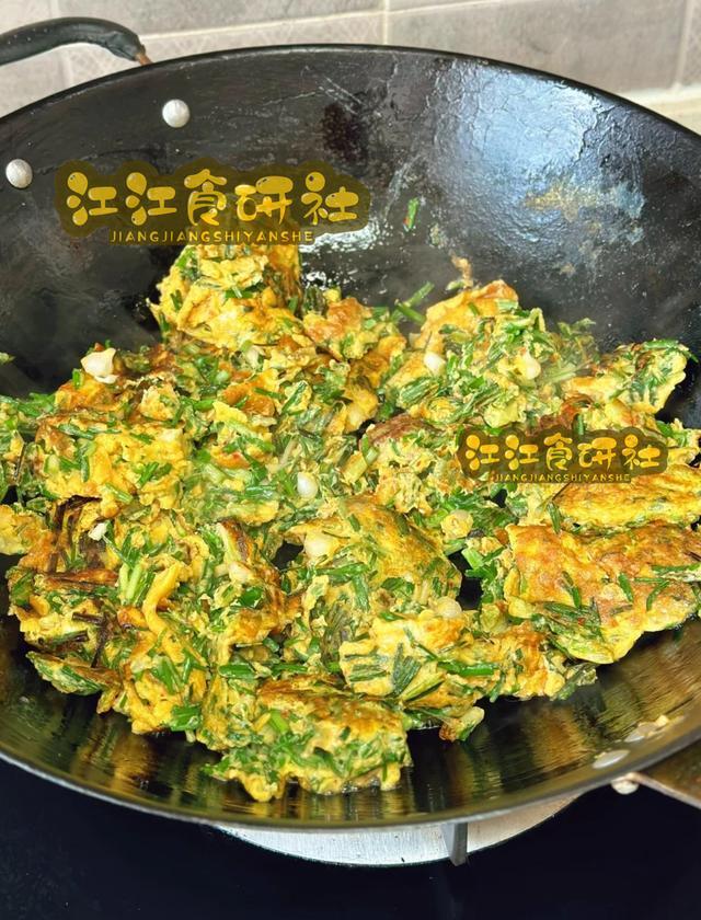 当鸡蛋炒至七八成熟,呈现大块蓬松的金黄色时,撒入薤白叶段,快速翻炒几下。