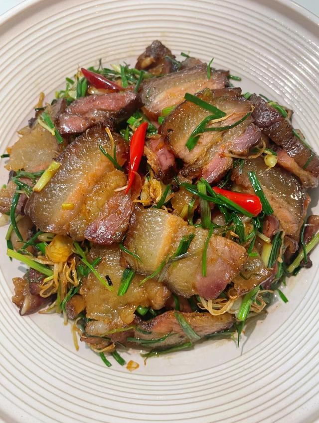 目标是逼出腊肉自身透明的油脂,并且让肉片边缘卷起,呈半透明状。这时腊香味最为浓郁。